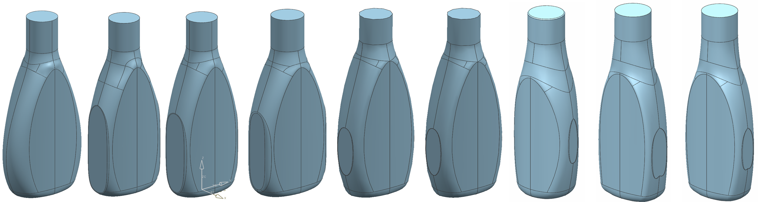 Another example of the power of parametric modeling and Class A surfacing. By using “Part Families” one file driven by a spreadsheet creates multiple variations. Here I explored the size and shape of flats on the side of dressing bottles in order to reduce shingling on the production line. This cut development time from hours to minutes.